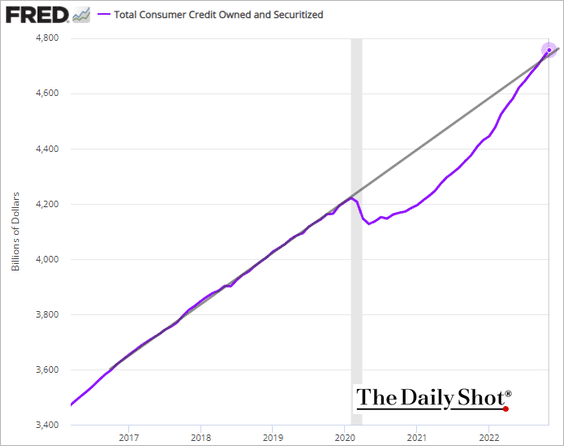 US consumer credit is above it’s pre-COVID trend even though credit card rates are higher than they’ve been in decades: